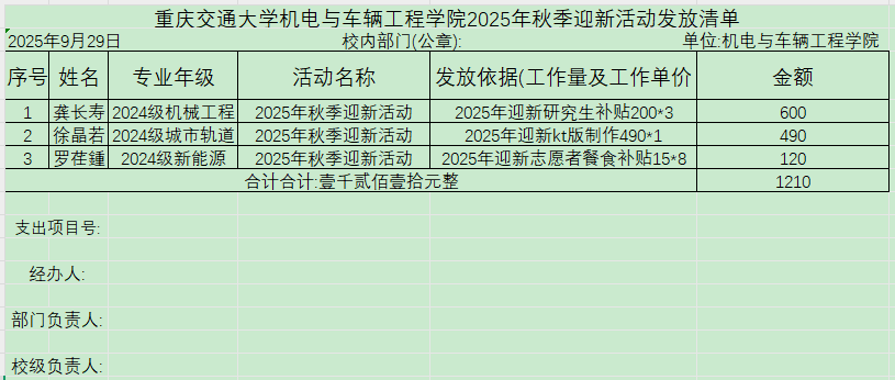 重庆交通大学机电与车辆工程学院2025年秋季迎新活动发放清单