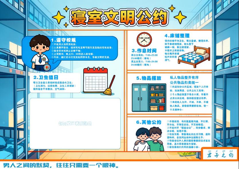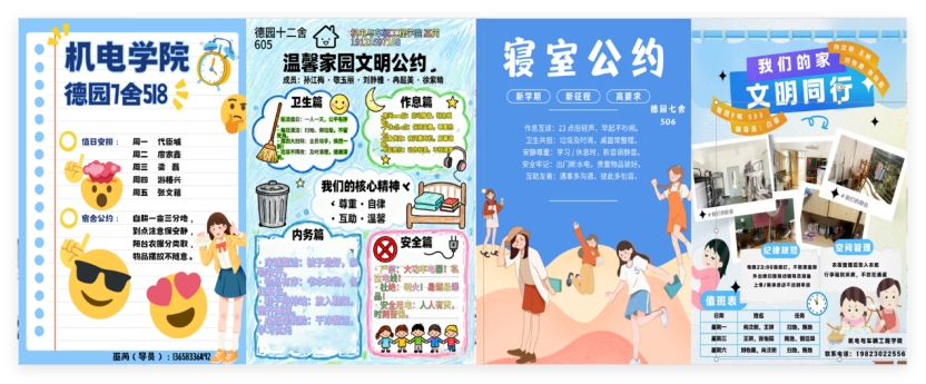 ■多维推进,打造“净室优寝”品牌活动。活动以“知礼以立·净室优寝”为主题,深度融合中华优秀传统文化与现代劳动教育理念,从四个维度系统推进:一是常态清扫,共建“净室”环境。学院确立每周四为“周四·净室日”,通过第二课堂平台发布任务,引导学生完成每周一次的大扫除,并做好日常维护。辅导员协同宿管人员,围绕消防安全与内务卫生要求进行督导检查,确保寝室实现“整洁、味清、物少、美观”的目标。二是公约协商,凝聚“优寝”共识。各寝室在辅导员组织下召开文明建设会议,民主商议并制定涵盖作息、值日、互助等内容的“寝室文明公约”,经全体成员签名后彩印张贴,有效提升了学生的集体责任感和归属感。三是劳动赋能,提升整理技能。学院创新性地邀请退役大学生士兵、整理收纳达人开展“断舍离”与“巧收纳”劳动教育沙龙,通过分享空间规划、物品整理等实用技能,帮助学生从源头上解决“脏乱差”问题,并鼓励以VLOG视频形式记录和展示劳动成果。四是结对帮扶,发挥榜样力量。学院大力推动“三星”“四星”文明寝室创建,设立“星级寝室开放日”供师生观摩学习。同时,组织“星级寝室”与“脏乱差寝室”开展结对帮扶,强化朋辈引领,形成了“先进带后进,后进赶先进”的良性互动氛围。