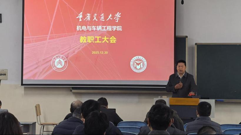 2025年12月30日,机电学院2025年第七次教职工大会在南岸校区第三教学楼召开。此次大会旨在深入学习贯彻党的二十届四中全会精神,全面总结2025 年学院工作成效,谋划2026年重点任务并部署安全稳定工作。学院党委书记刘建新主持会议,领导班子成员及全体教职工参加。