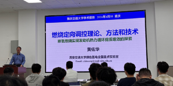 2026年4月10日下午,国家级领军人才、国际燃烧学会首届会士、中国内燃机学会常务理事、西安交通大学博士生导师黄佐华教授应邀莅临我校作题为“燃烧定向调控理论、方法和技术掺氢燃烧实现热力循环提质增效率的探索”的学术报告。报告在南岸校区第三教学楼101教室举行,机电学院院长赵树恩、航空学院院长何义团以及一百余名师生聆听了学术报告,报告活动由赵树恩主持。