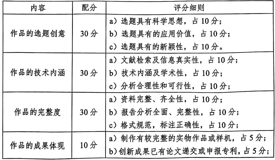 参赛作品的评审将按照《中国大学生机械工程创新创意大赛过程装备实践与创新大赛评审方法》进行。赛事评审专家由赛事专家指导委员会委员、各相关高校、行业企业资深专家组成。评审原则上采取本校参赛作品专家回避制度。本科生组和研究生组参赛作品采取分组评审。评审专家将依据参赛作品的选题创意(30%)、作品的技术内涵(30%)、作品的完整度(30%)以及作品的成果体现(10%)四个方面对参赛作品进行评审,具体评分细则如下: