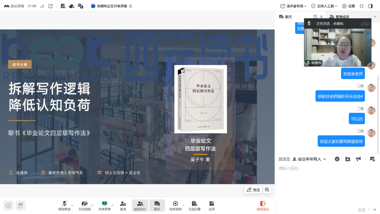 3月29日晚,应“四元读书”公众号邀请,机电学院支部书记双带头人工作室负责人余腾伟副教授做客线上直播间,担任“聊书”活动主讲人,以《毕业论文四层级写作法》为主题,与全国师生展开深度交流。