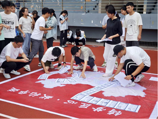 除了激烈的挑战,活动现场更充满了温馨的暖流。一幅巨型的中国地图化身为传递乡情与祝福的纽带。同学们纷纷在地图上自己家乡的省份位置,写下对亲人的思念与对祖国的祝愿。