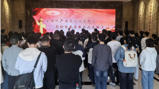 清风拂面,誓言铮铮。在基地序厅,全体师生党员在纪委书记胡东的领誓下,面对鲜红党旗,庄严举起右拳,重温入党誓词。“我志愿加入中国共产党……”的铿锵誓言回荡在厅中,传递出不变的初心与坚定的党性。一旁肃立的“青马工程”学员全程观摩,沉浸式感受党员的使命与担当,实现了党性锤炼与理想信念引领的深度融合。