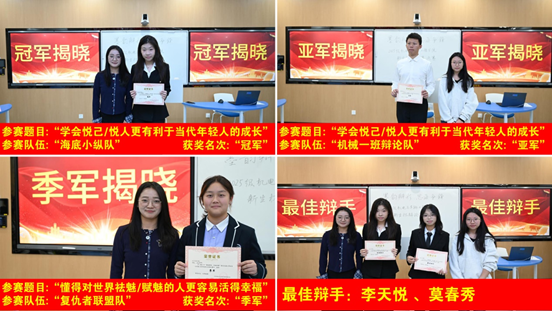 从立论质询到自由辩论,双方辩手你来我往、妙语连珠,既展现了对“成长”命题的多元思考,又体现了机电学子的思辨深度与语言魅力。最终,“海底小纵队”摘得桂冠,李天悦荣获“最佳辩手”;“机械一班辩论队”获得亚军,戴铵奇,李昊洋等的精彩表现也获得全场认可。