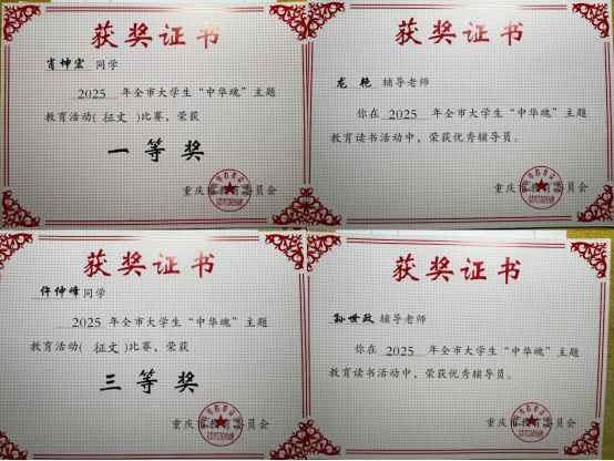 近日,由重庆市教育委员会主办的2025年全市大学生“中华魂”主题教育读书活动征文比赛结果揭晓。我校机电与车辆工程学院学子斩获市级一等奖、三等奖,指导教师龙艳、孙世政荣获“优秀辅导员”称号,展现了学校在红色文化育人方面的扎实成效。