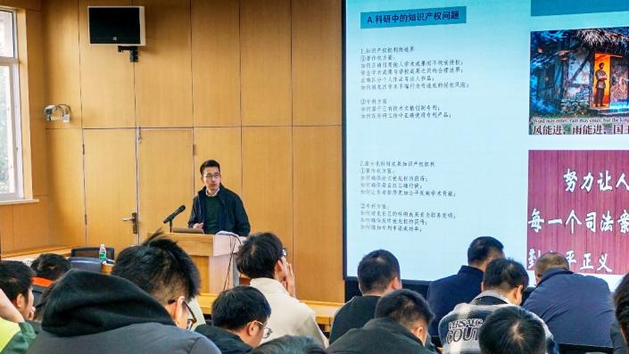 吴小忠法官以《高校科研中的著作权和专利权问题》为题,结合自身丰富的案件审理实践经验,聚焦高校科研实际,深入浅出地剖析了著作权与专利权领域的核心问题。吴法官从学术论文署名权、优先权的法律保护,著作权的客体、归属、合理使用界限,到专利的申请条件、授权要件、权利保护范围,进行了系统梳理。同时引用了大量真实审理案例,生动揭示了高校科研中的成果归属风险、论文发表过程中的署名权与抄袭认定困境、专利申请与侵权纠纷等常见问题,并给出了切实可行的风险防范建议。互动环节,现场师生就实验数据处理与版权、学生课题成果知识产权归属等问题与法官进行了深入交流,气氛热烈。